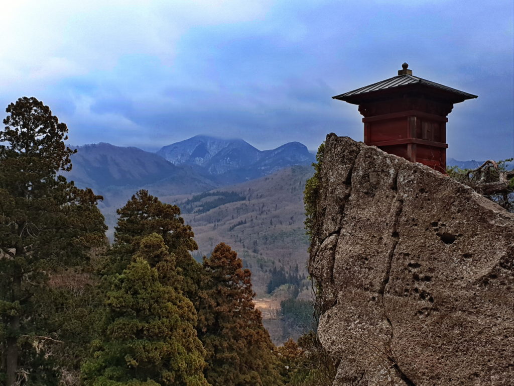 We spotted patches of snow on the train ride to the mountain temple in Yamadera and wondered if we will be blessed with a snowy mountain scene. Instead, we were greeted by a fearsome chilly wind raging like a fast-flowing river between the station stop and the temple opposite. We could still hear the howling of the wind when we reached the temple entrance after a horrendous crossing. It took about 1000 steps to the top. It was not a strenuous climb, and the wind seemed to have deserted us, or maybe the mountain was blocking us from its ferocity.